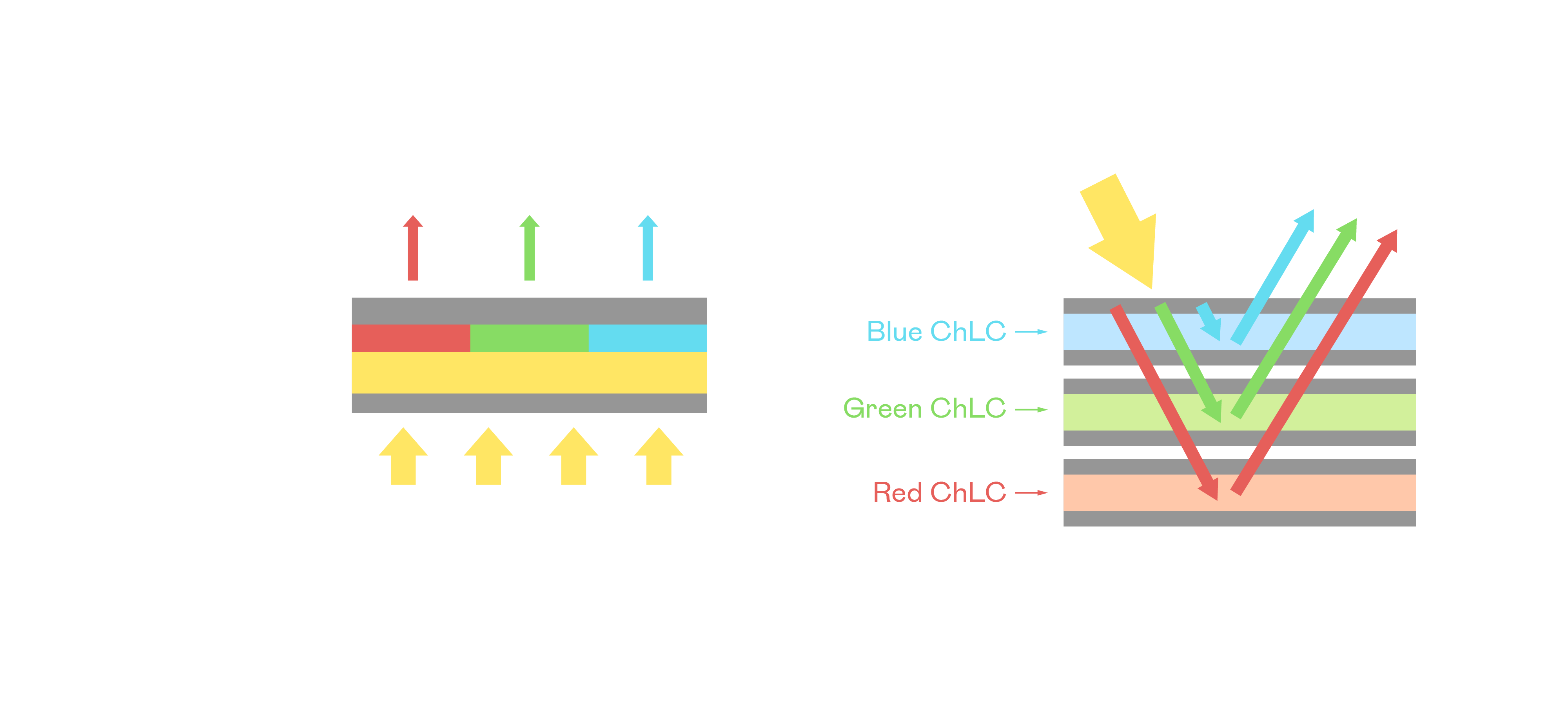 ror体育胆固醇液晶显示器是由红、绿、蓝三层胆固醇液晶面板堆叠而成,并采用无彩色滤光片设计,减少环境光在反射过程中的损耗。